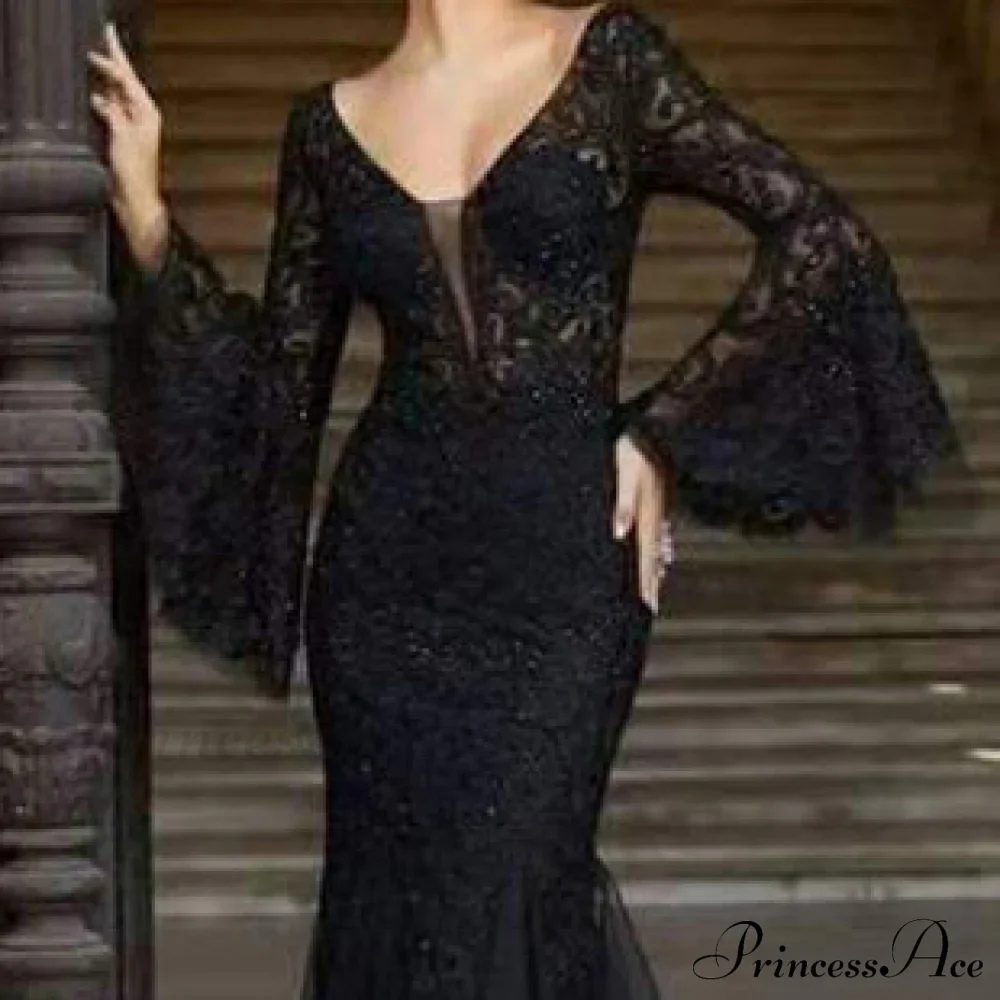 Get an effortlessly beautiful look in our stunning Brooke lace formal dress! She features a V neckline. long fitted sheer lace sleeves. a sheer lace back with a keyhole and lower back cut out. and a floor-length. curve-hugging mermaid silhouette. Complete your gorgeous look with rhinestone statement earrings and a sleek ring pack.
